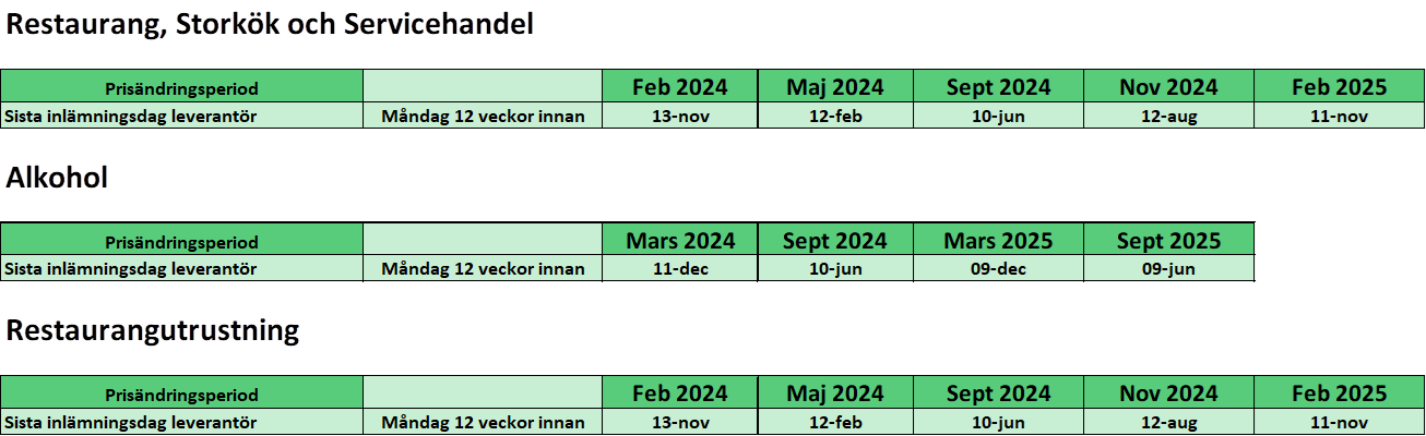 Prisändringarna skall vara Menigo tillhanda senast måndag 12 veckor innan det datum då prisändringen träder i kraft.