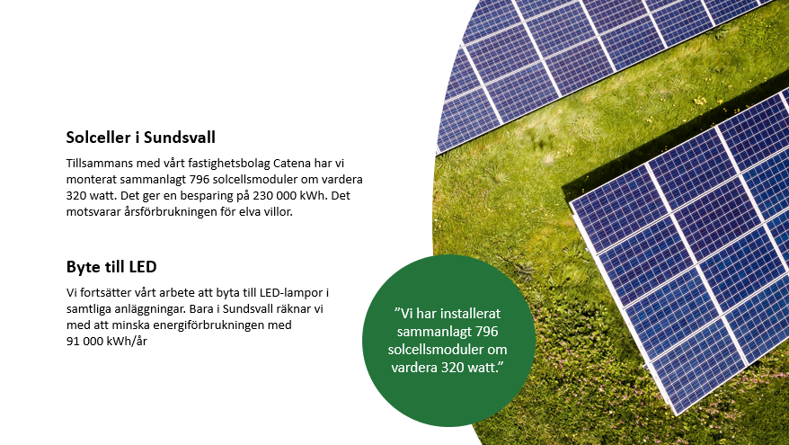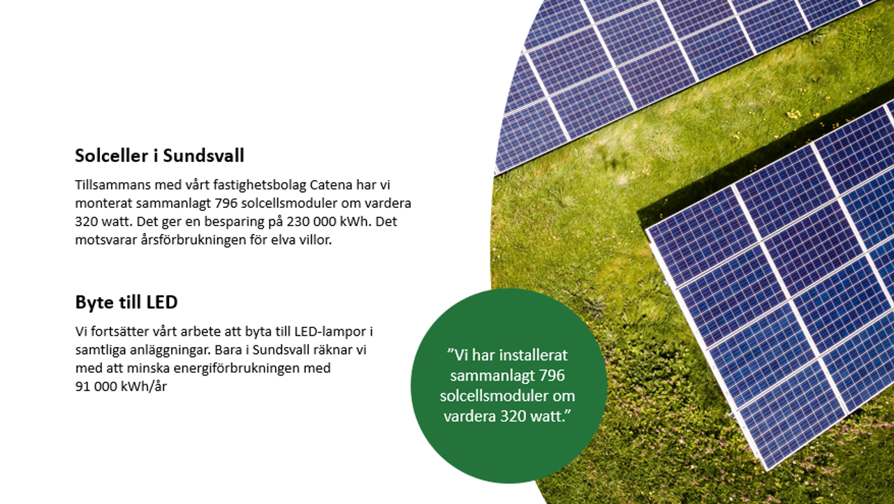 Vi har monterat sammanlagt 796 solcellsmoduler om vardera 320 watt. Det ger en besparing på 230 000 kWh. Det motsvarar årsförbrukningen för elva villor.