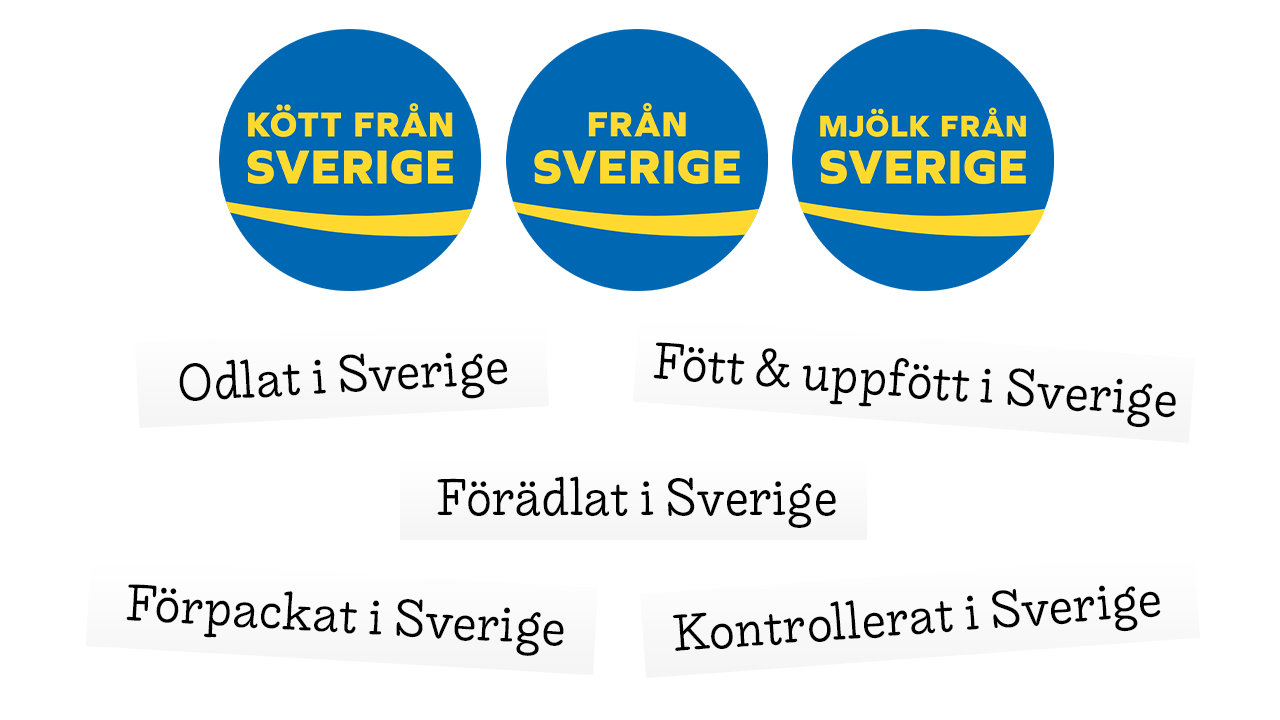 Ursprungsmärkningen Från Sverige, Kött från Sverige och Mjölk från Sverige gör det enkelt att hitta svenska produkter när du handlar. För att varan ska godkännas för märkningen ska den leva upp till märkets kriterier – odlad, född och uppfödd, förädlad och förpackad i Sverige.