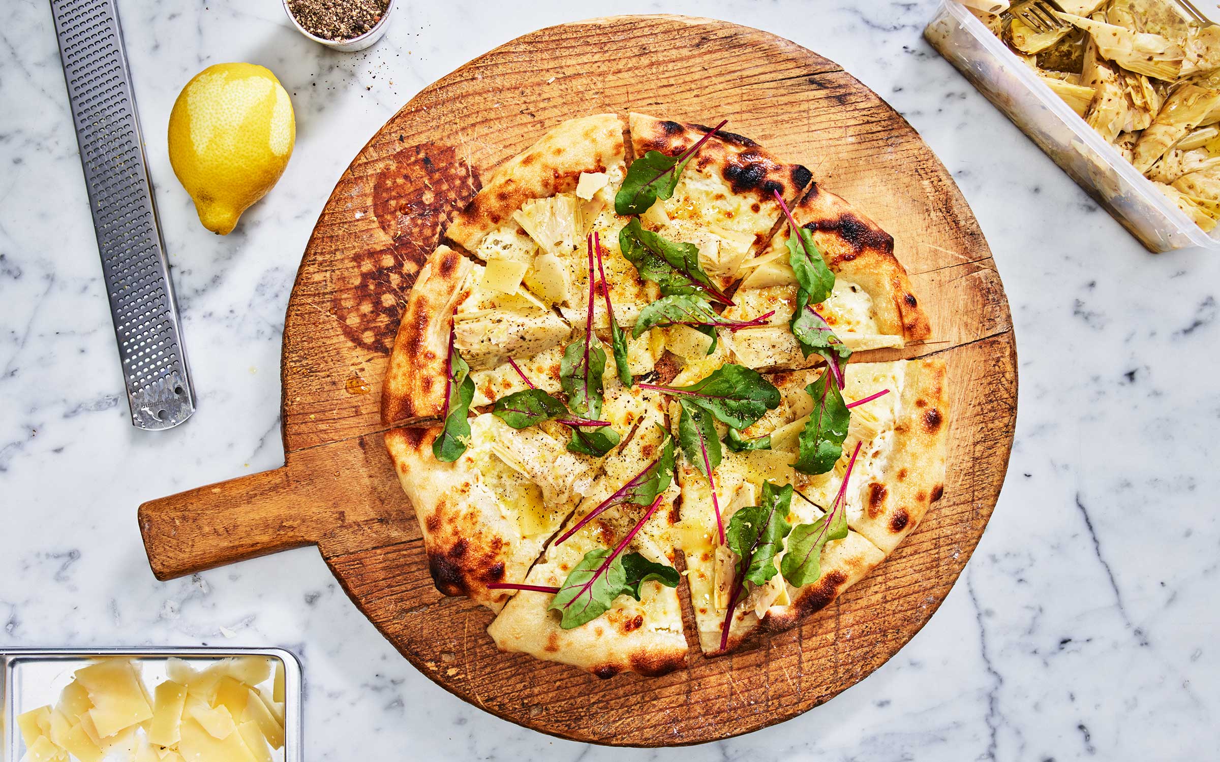 Pizza med kronärtskocka, citron och svartpeppar