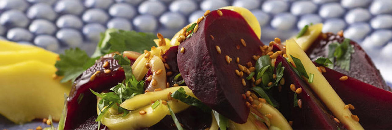 Dressa rödbetsklyftorna med dressingen och vänd ner grovhackad mango och finskuren salladslök och pudra över chilirostade sesamfröna. Låt gärna dra innan servering.