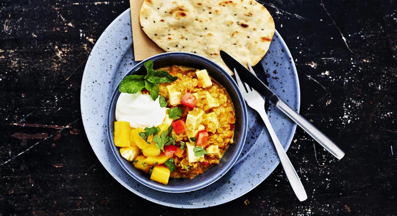 Servera grytan direkt toppad med tärnad mango och tomat, gräddfil och plockade örter. Servera gärna med naanbröd.