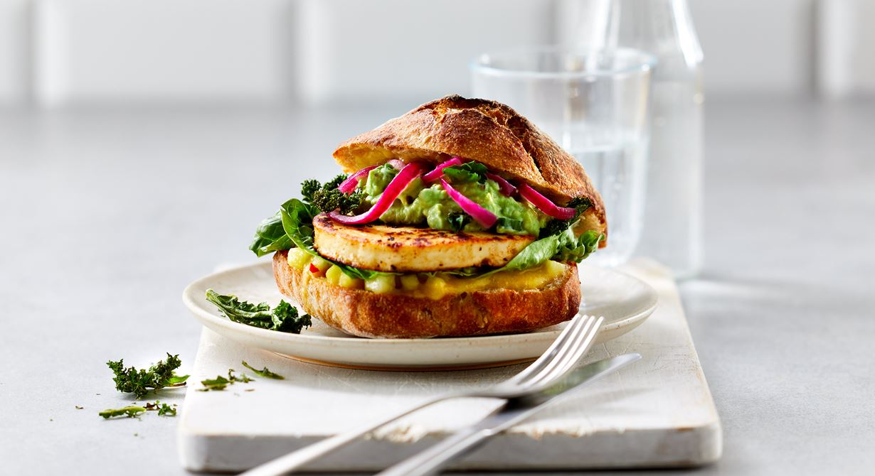 Skär osten i skivor à 90 g. Hetta upp smör i en stekpanna på medelhög värme och stek osten 2–3 min på varje sida. Tryck lätt på dem så de blir jämnt brynta.Värm ev hamburgerbröden i ugnen. Bre mangosås på den undre brödhalvan. Fortsätt med romansallad, stekt ost, grovmosad avokado, picklad rödlök, smulad rostad grönkål samt den övre brödhalvan.