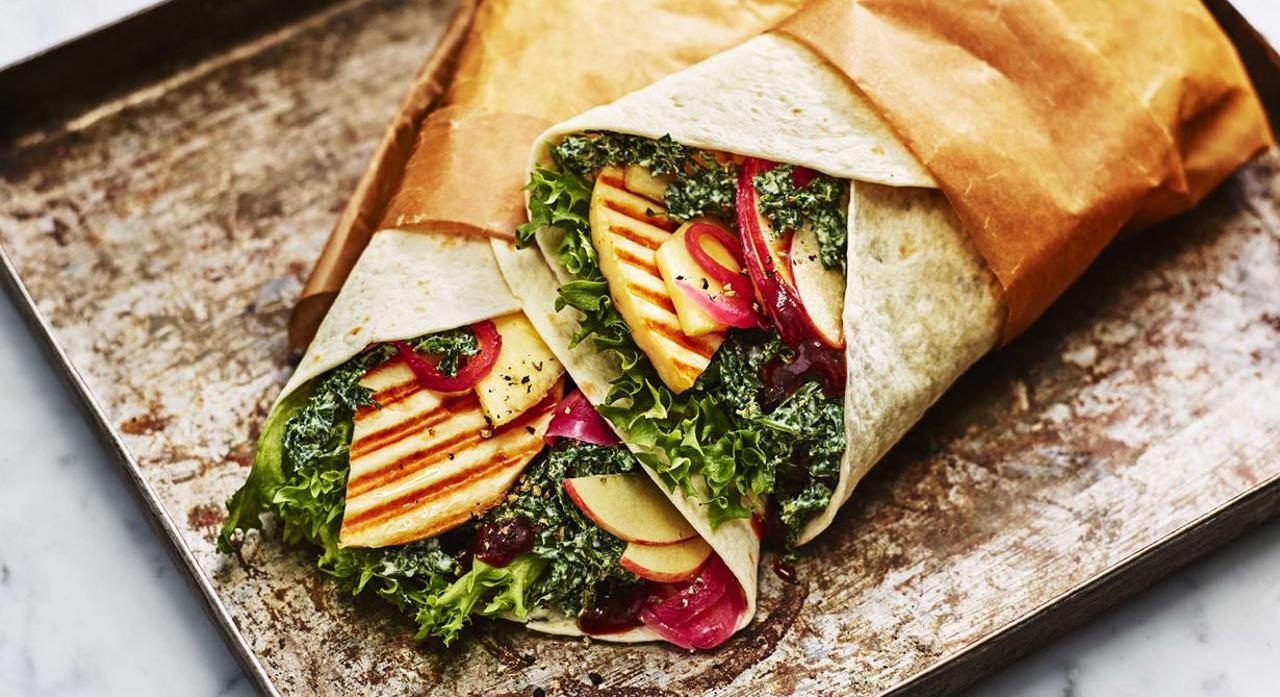 Sältan i Grilling cheese ger fin kontrast till sötman i grönkålsslaw. Wrap är en smidig lunchrätt för gästerna att plocka med sig och som uppskattas av många.Gör så här