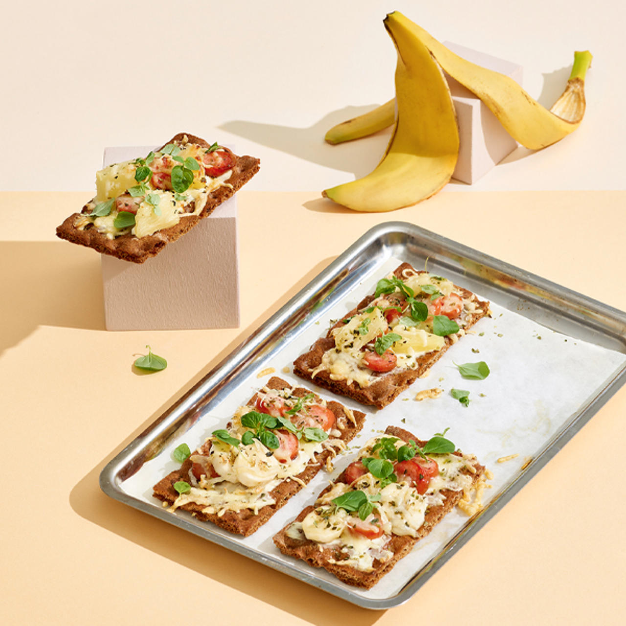 - Lägg på korv, skivad banan eller ananas, riven ost och oregano.