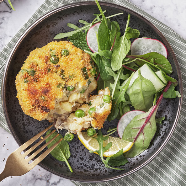 är gyllenbrun runt om och genomstekt invändigt. Servera i hamburgerbröd med tartarsås och grönsaker.
