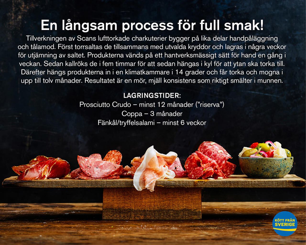 Scans lufttorkade charksortiment består av Coppa, milt smaksatt med vitpeppar, koriander och enbär, rimmad Prosciutto Crudo med naturligt nötig smak, Fänkålssalami med korn från hela fänkål och Tryffelsalami med äkta gotländsk tryffel.