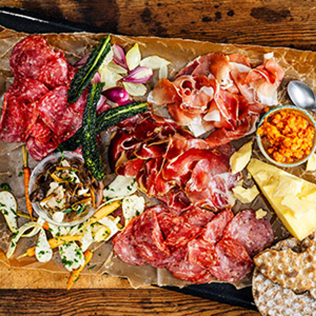 Toppa den med Tryffelsalami, Fänkålssalami, Coppa och Prosciutto på rapsgris från nio utvalda svenska gårdar.