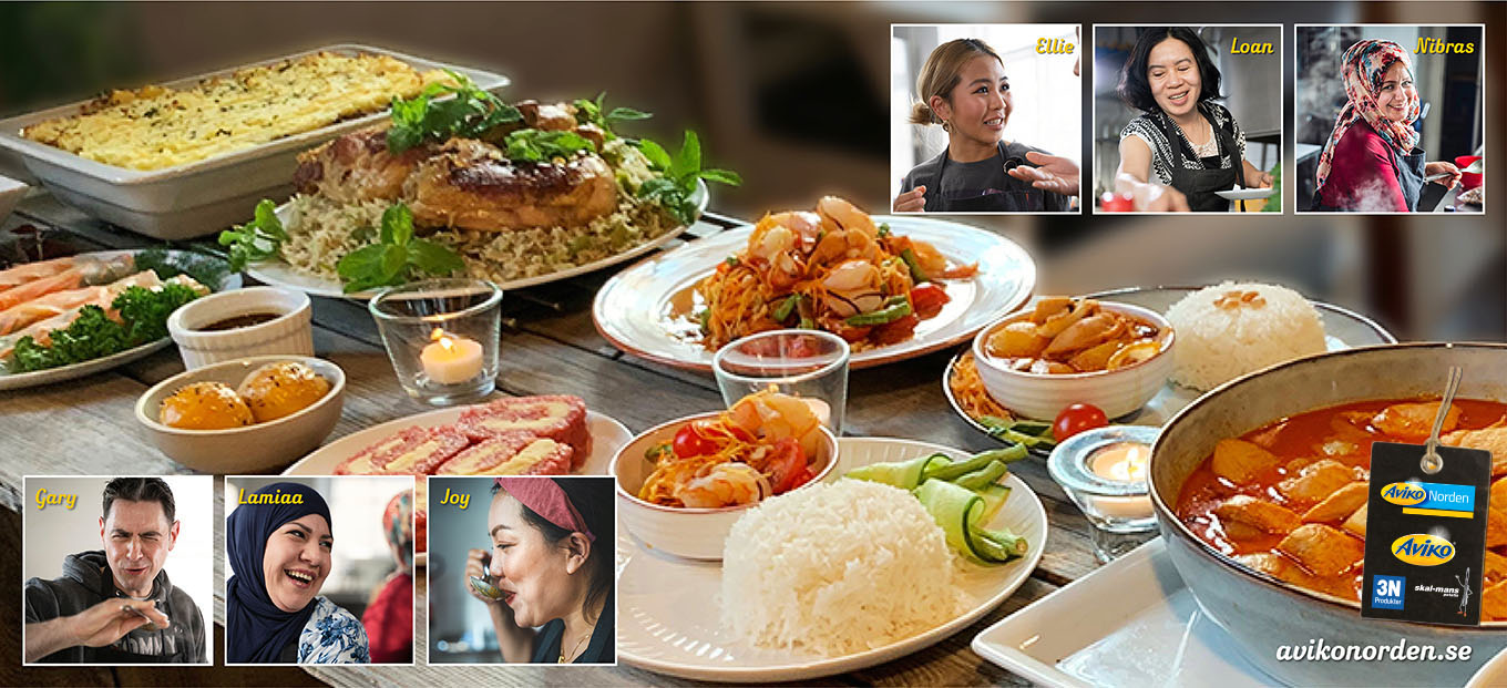 Recepten som Avikos medarbetare presenterar är Ellies thailändska Som Tam - Morotssallad, Loans Vegetariska sommarrullar Goi Cuon Chay, Nibras irakiska Temenbagela – kyckling med ris, Garys irländska Shepherd’s pie, Lamiaas irakiska Kyckling Biryani och Joys thailändska Kyckling Massaman Curry.Ellies thailändska Som Tam - Morotssallad