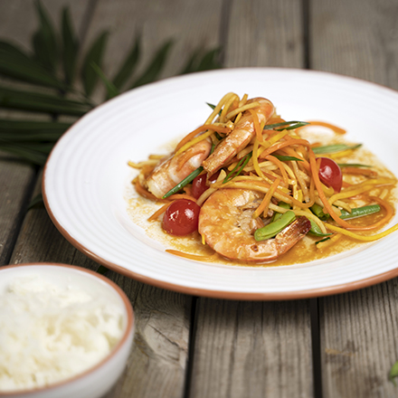 Garnera gärna med jordnötter vid servering och några hela tomater. Servera med kokt ris eller som en thailändsk sallad.
