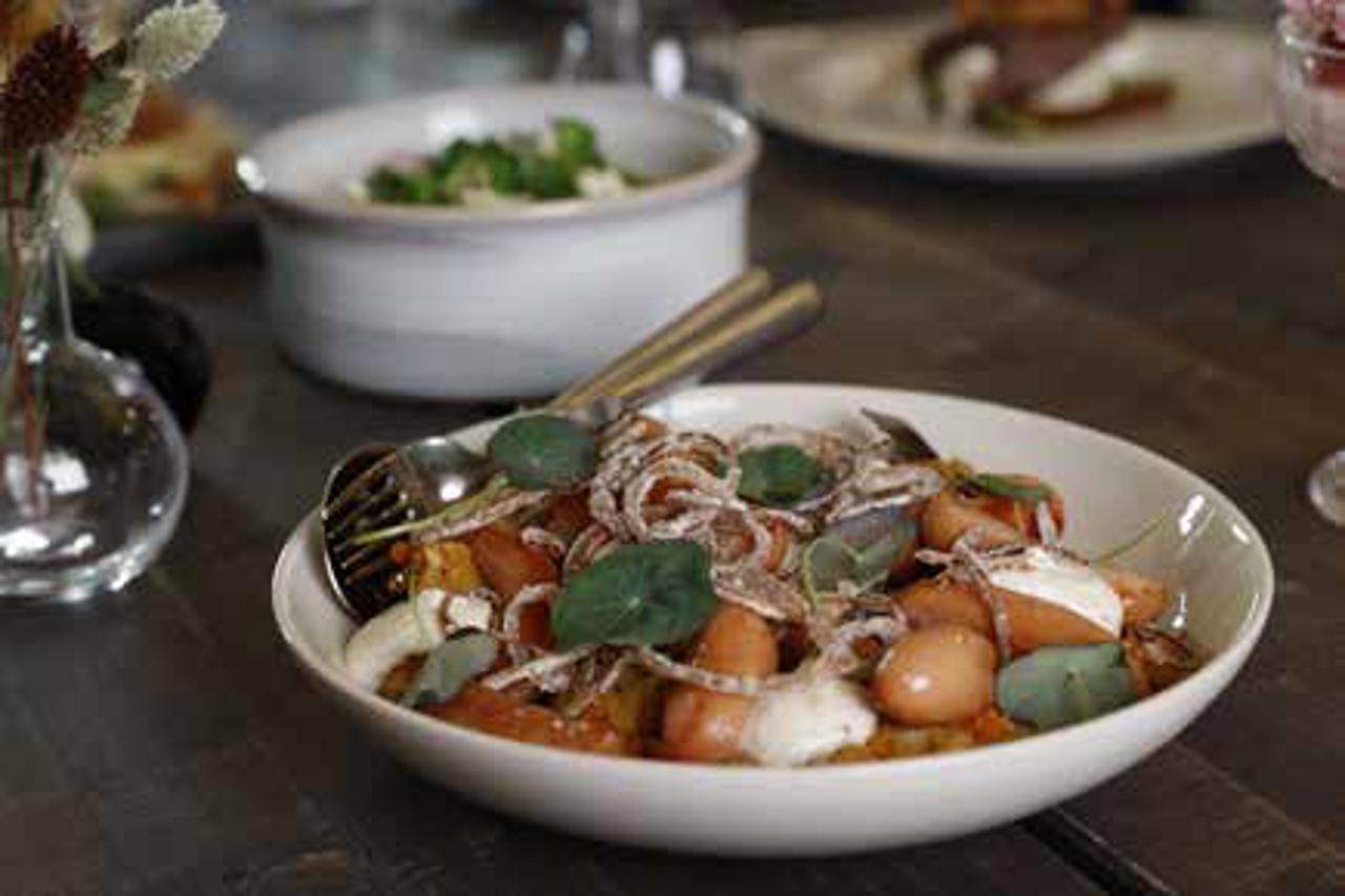 Lithells prinskorv på en rotfruktbädd, friterade lökringar, senapskräm och färska örter