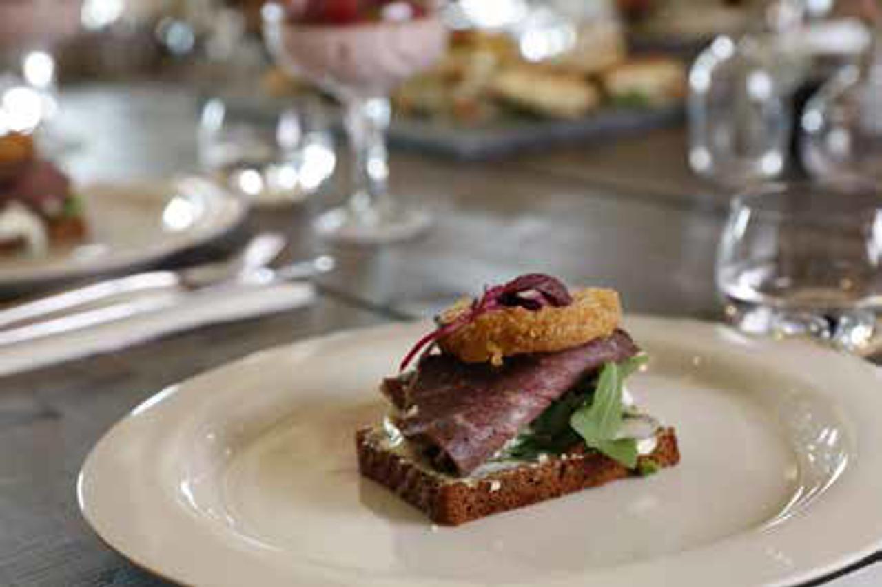Smörrebröd med Lithells rostbiff, krämig potatissallad och friterad lökring
