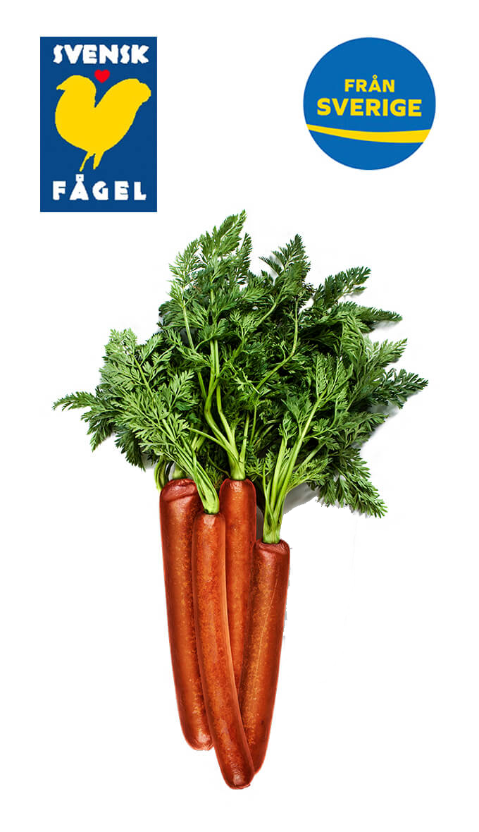 Med svensk fågel och svenska morötter är Klimat marknadens första kycklingkorv under 2 kg CO₂e/kg. Men den smakar och ser ut precis som en vanlig korv. Lurigt va?