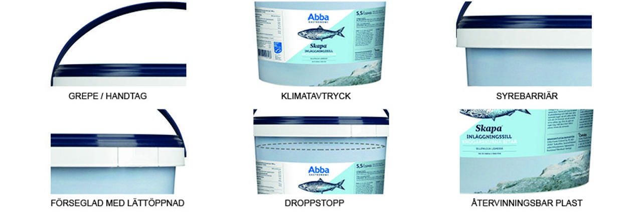 Klimatavtryck - Lägre CO2-belastning jämfört med tidigare burkar. Vi använder mindre totalmängd material och tack vare staplingsbarheten behövs färre transporter till fabrik. Hinkarna tillverkas i Sverige.