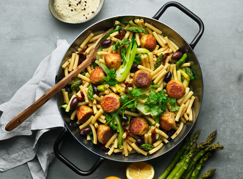 - Häll bort vattnet från pastagrytan och blanda ner sparrisen, oliverna och soltorkade tomaterna.