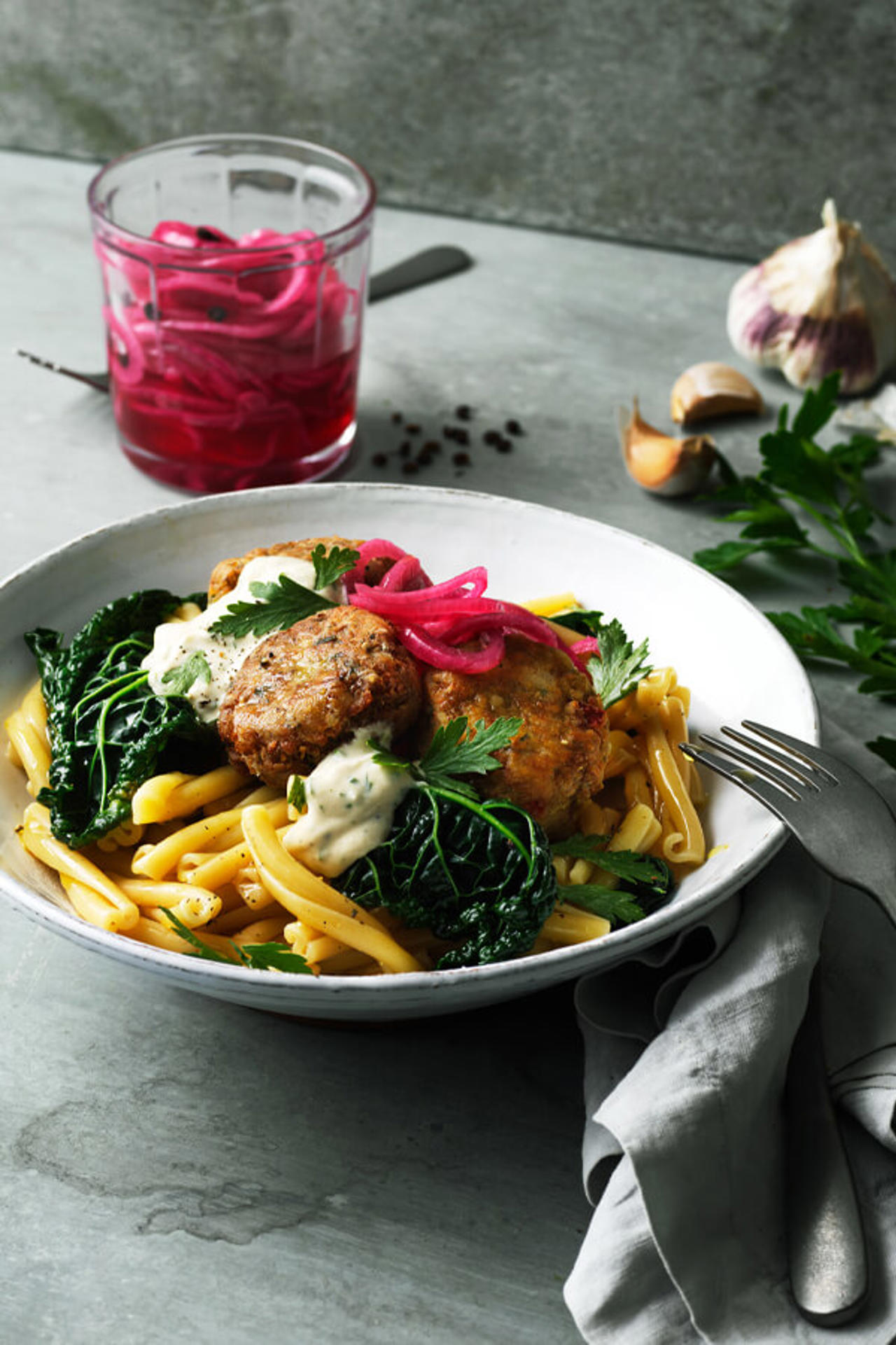 Recept Casarecce med svartkål, falafel och taratorsås