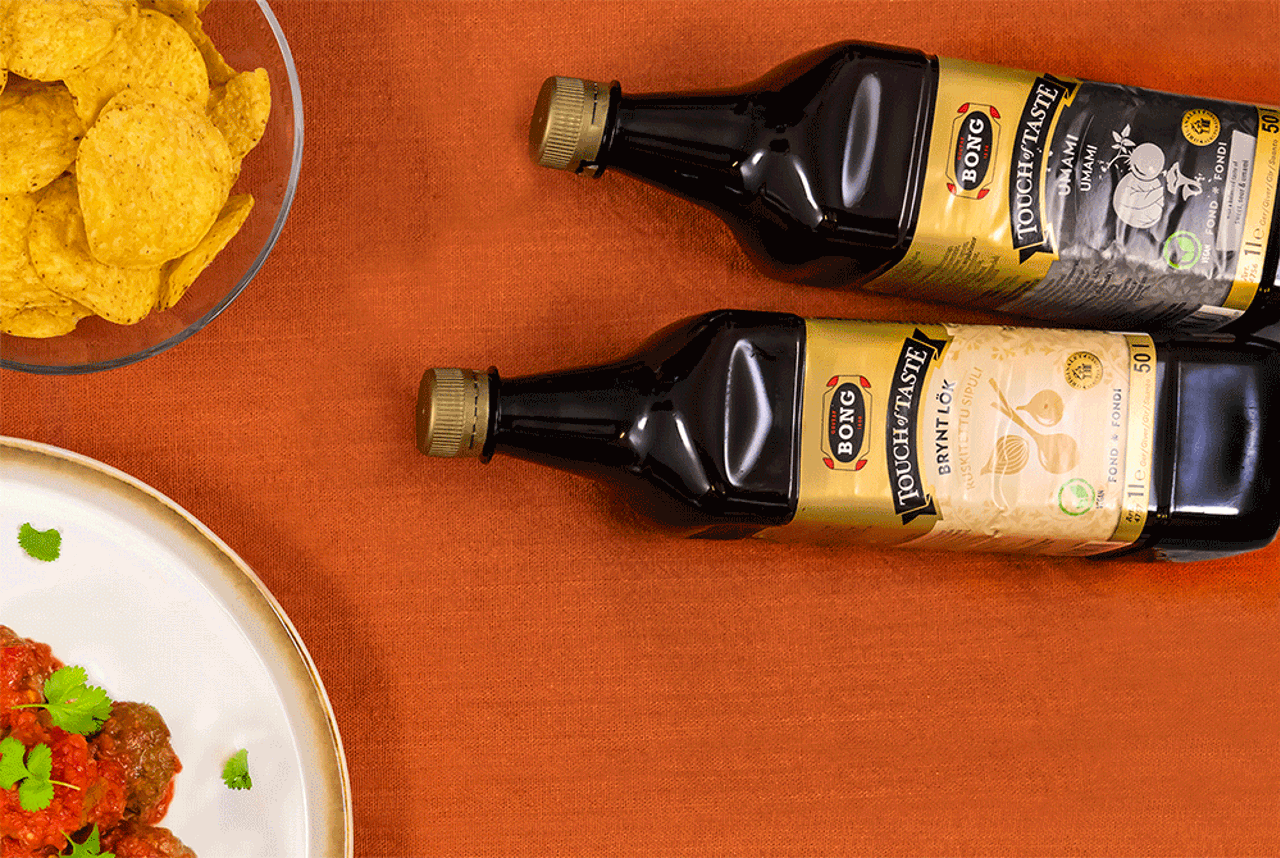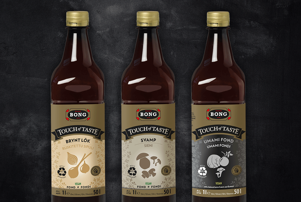 Touch of Tastes fonder finns på enlitersflaskor, speciellt framtagna för restauranger och storkök. Vi vill även passa på att rekommendera att använda Touch of Tastes fonder i kombination med någon av Bongs torkade buljonger. Detta ger en ytterligare tydlig karaktär och kittlar smaksinnena hos både stora och små. Ett exempel på detta är att vi har i Bong Grönsaksbuljong när vi kokar upp en chiligryta, för att sedan smaka av den med Touch of Taste Umamifond.