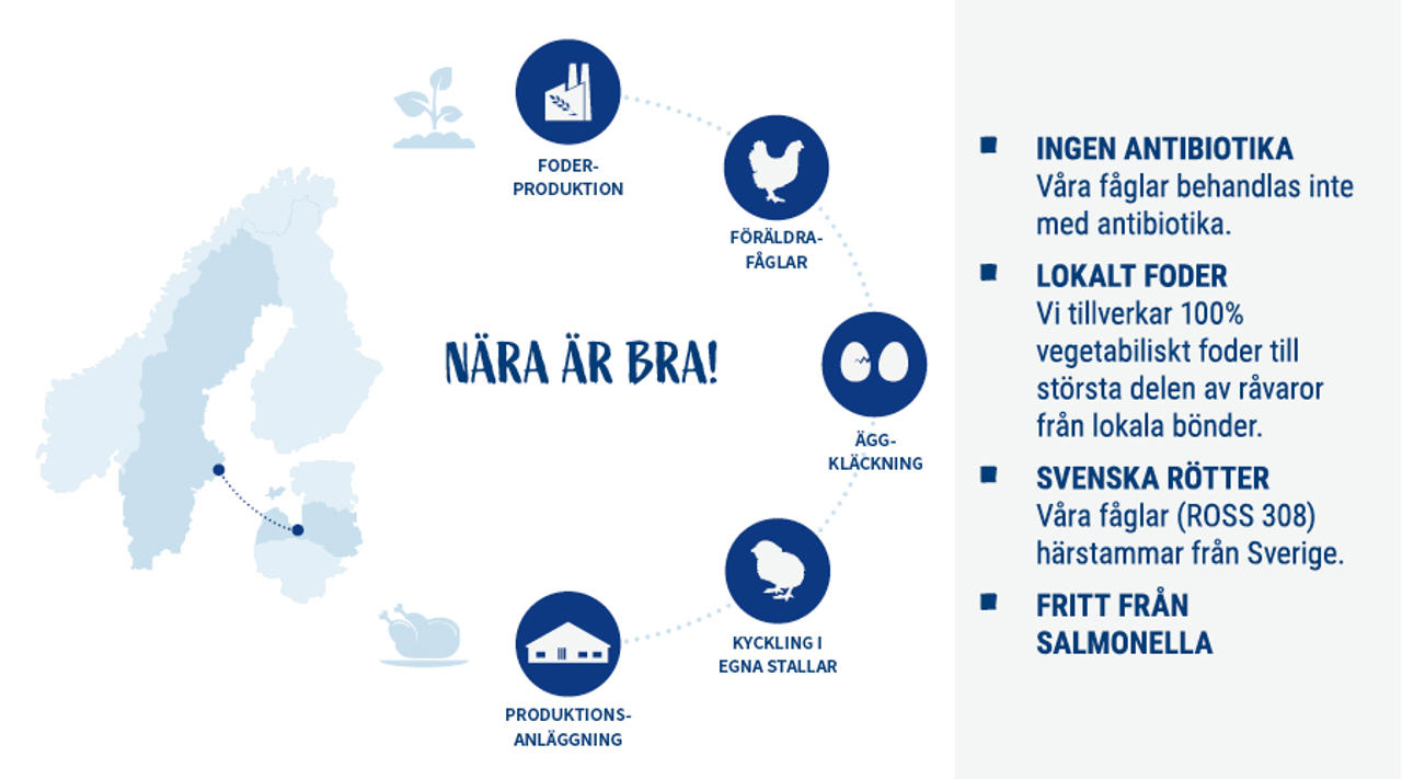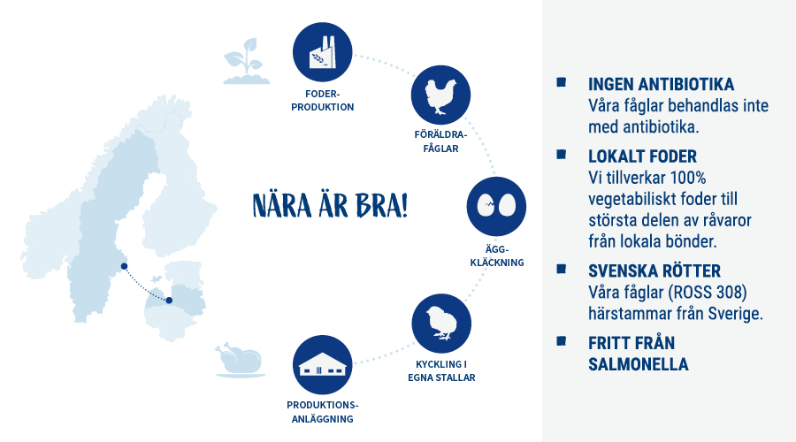 Vi ger våra fåglar ett bra och hälsosamt liv med välbalanserad kost, stimulans till aktivitet och minst sju timmars sömn. Tillsammans med noggranna kontroller och god hygien ger det starka och friska fåglar med bra immunförsvar och en uppväxt fri från antibiotika.
