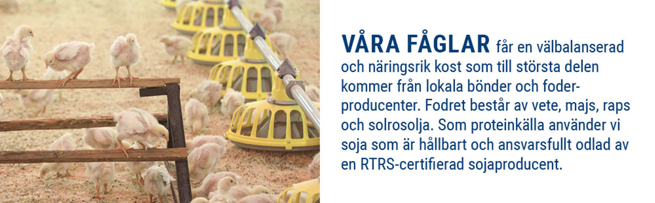 Våra fåglar får en välbalanserad och näringsrik kost som till största delen kommer från lokala bönder och foderproducenter. Fodret består av vete, majs, raps och solrosolja. Som proteinkälla använder vi soja som är hållbart och ansvarsfullt odlad av en RTRS-certifierad sojaproducent.