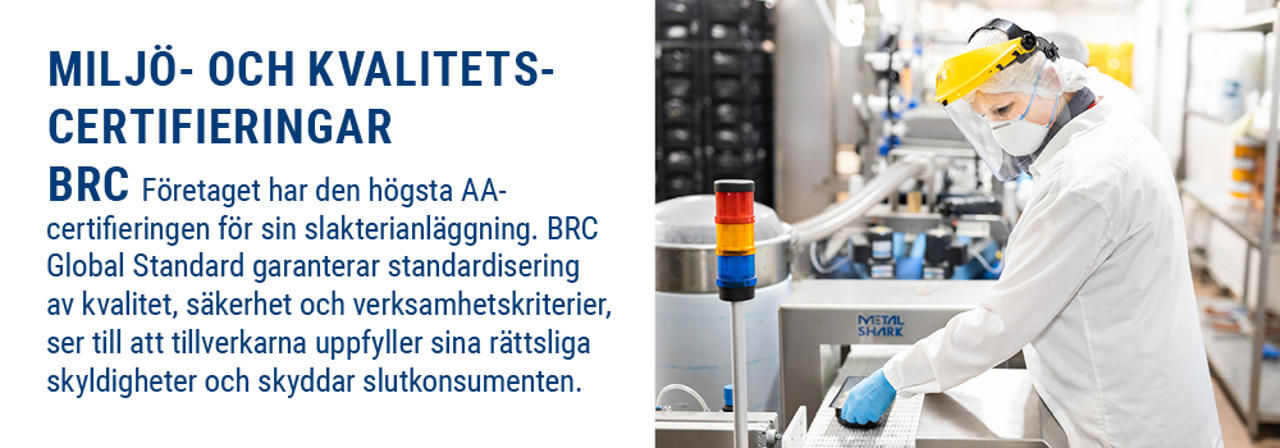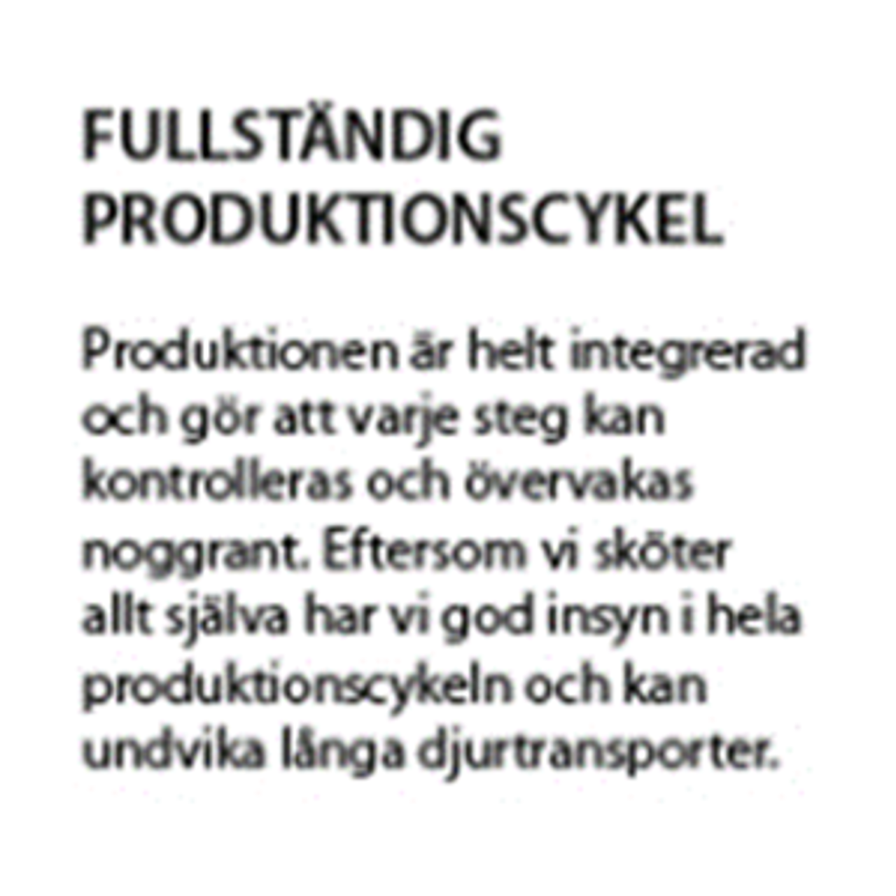 Produktionen är helt integrerad och gör att varje steg kan kontrolleras och övervakas noggrant. Eftersom vi sköter allt själva har vi god insyn i hela produktionscykeln och kan undvika långa djurtransporter.