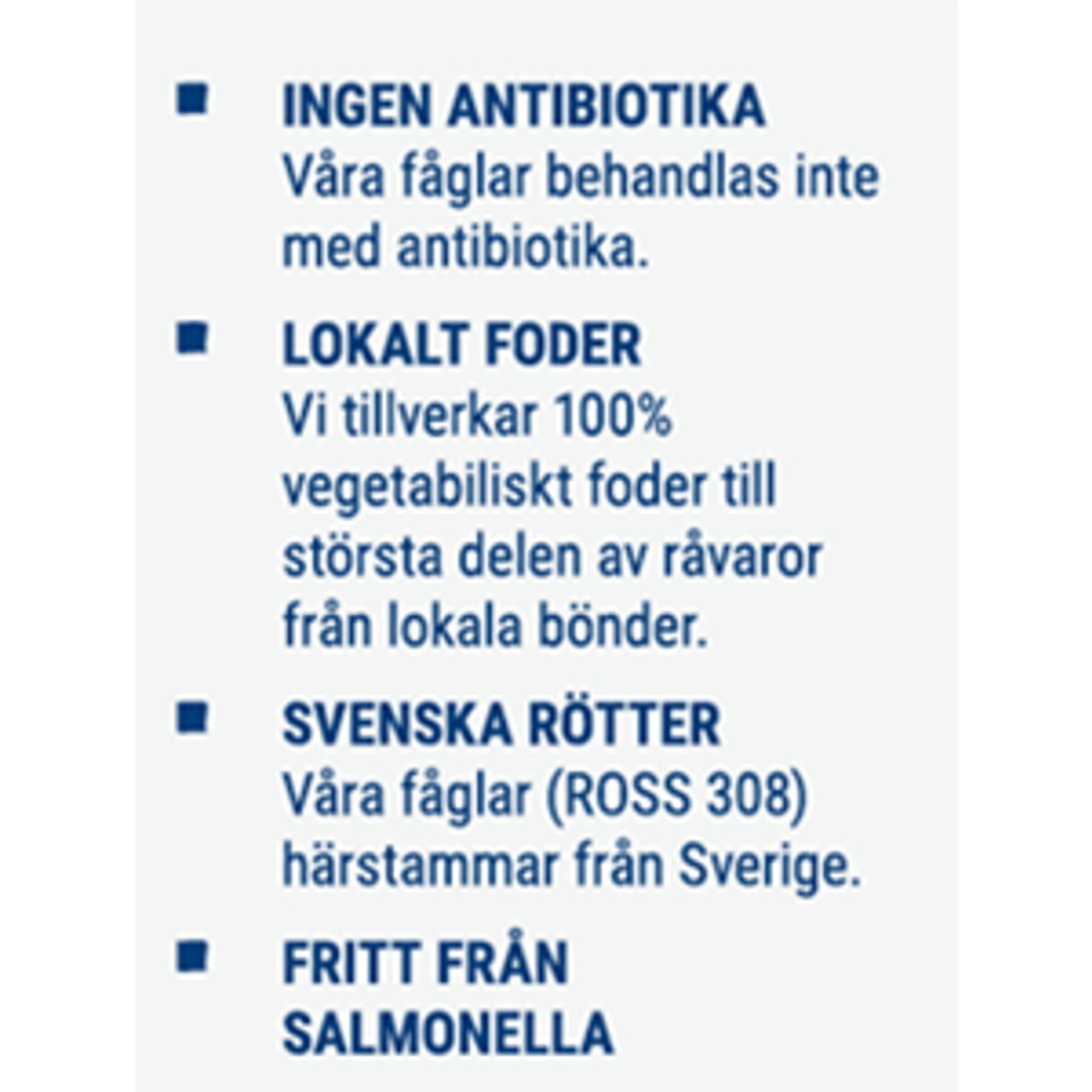 Vi ger våra fåglar ett bra och hälsosamt liv – välbalanserad kost, stimulans till aktivitet och minst sju timmars sömn. Tillsammans med noggranna kontroller och god hygien ger det starka och friska fåglar med bra immunförsvar och en uppväxt fri från antibiotika.