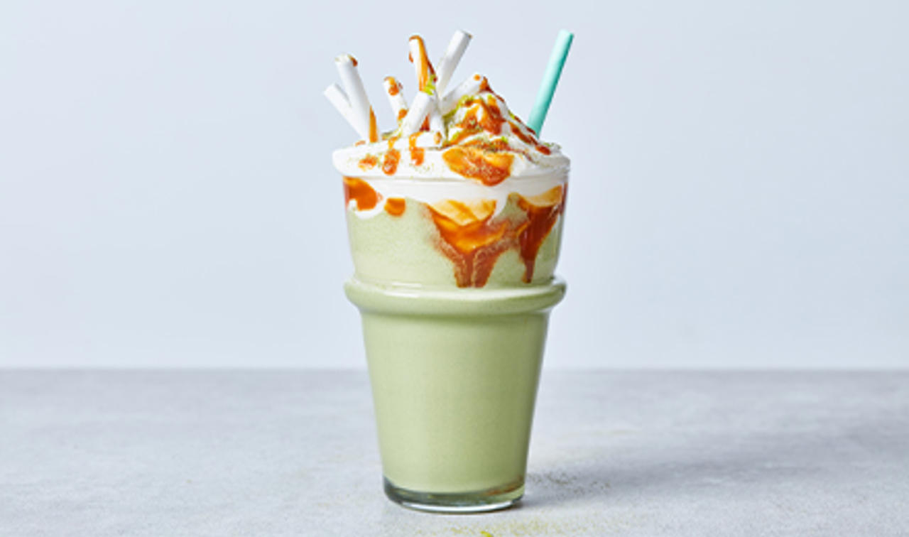 Efter burgare kommer shakes! Blanda samman Flora Plant 15%, matchapulver, glass, havremjölk och is. Toppa med vispad Flora Plant 31%, ös på önskad mängd karamellsås och njut!